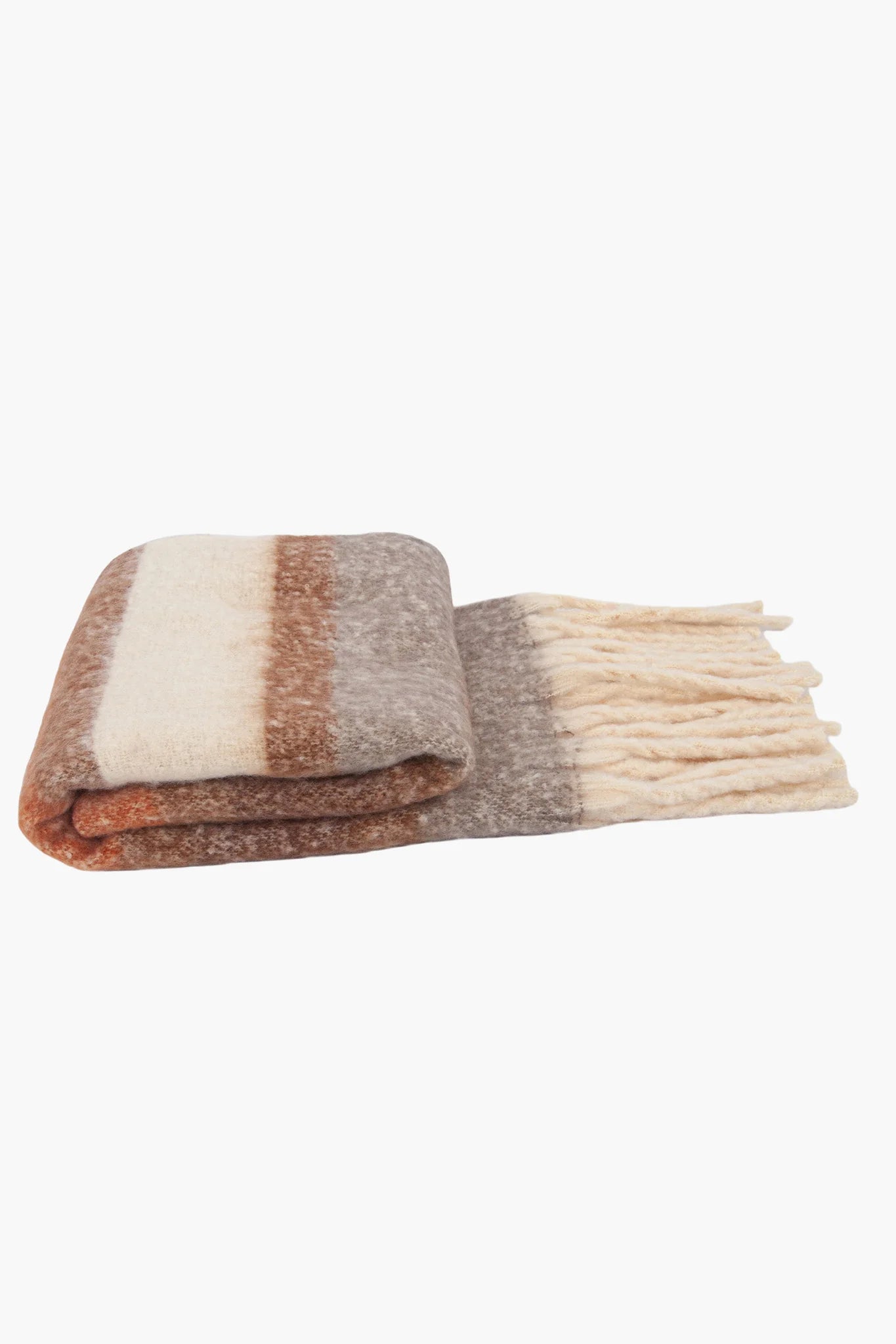 We love this gorgeous striped heavyweight scarf! It is crafted from soft to the touch viscose. Showcasing colour block stripes with a bohemian influenced tassel fringe. Suitable for autumn and winter, this oversized scarf is designed for warmth.