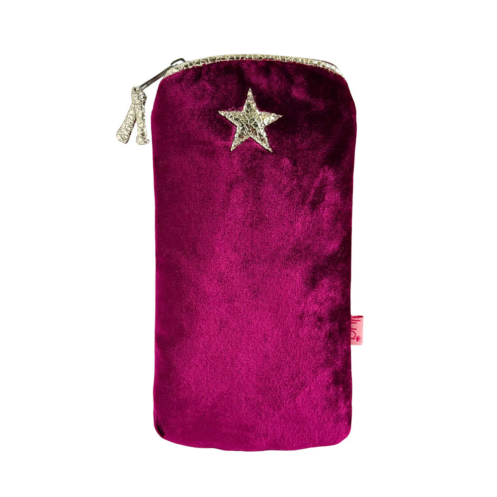 Minsky Loves.....this classic burgundy silk velvet, cosmetic pouch with little appliqued metallic faux leather star. This pouch has a top zip with a metallic  faux leather pull.