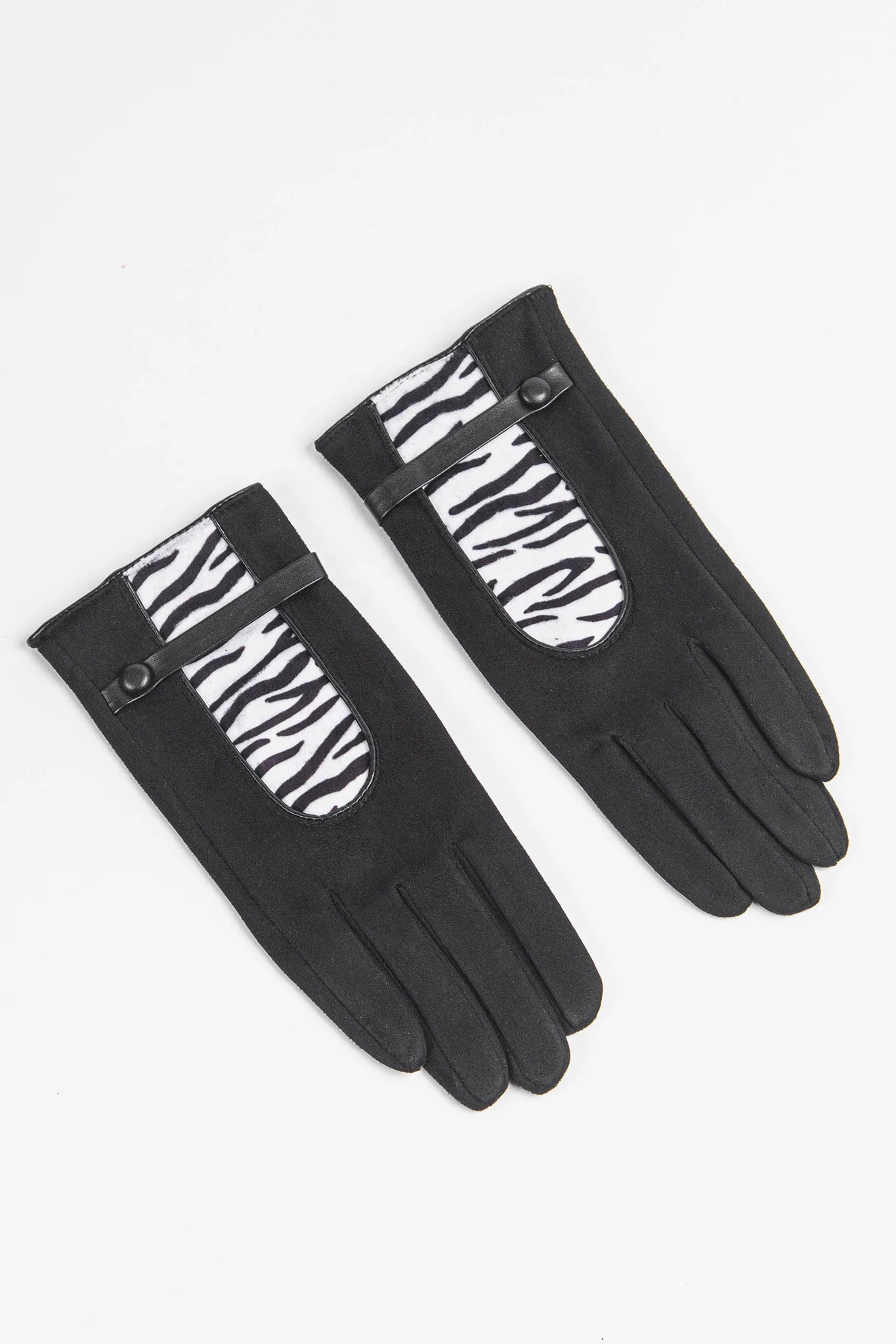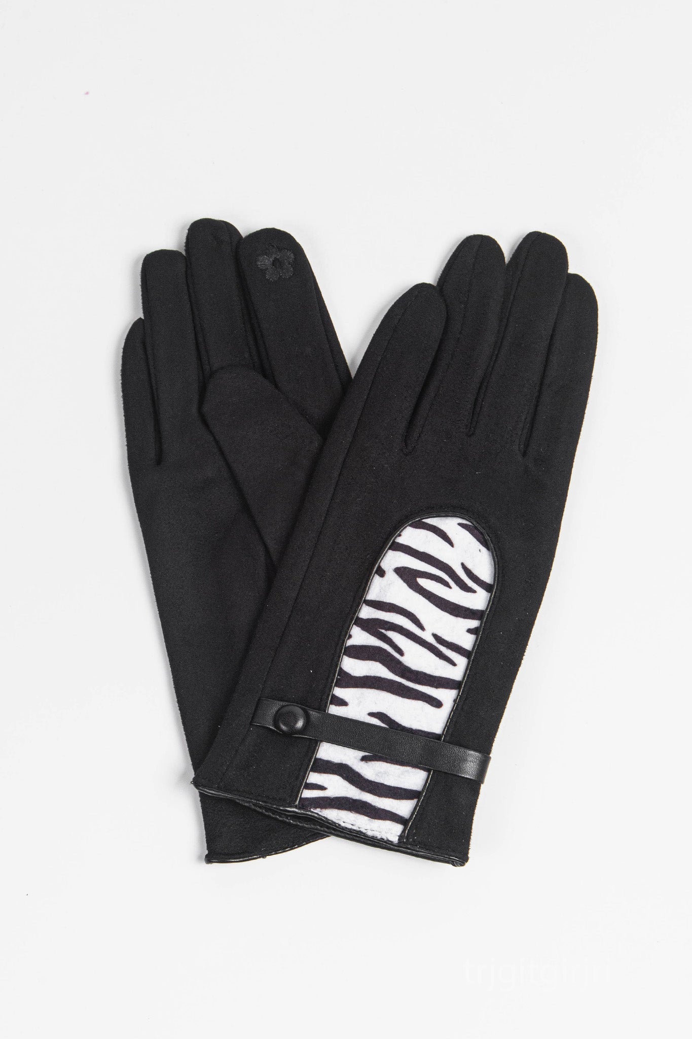 An elegant, black glove with a velvety-soft touch and black zebra print insert and PU leather strap.