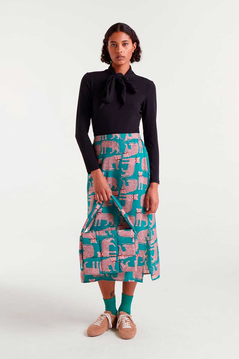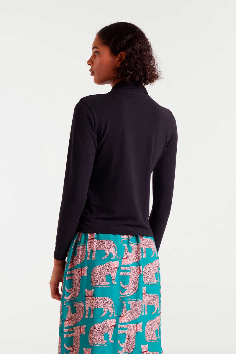 Fabulously versatile long sleeve top with tie at the neck in a lightweight, soft black jersey fabric. High neck with a bow and long sleeves. Also available in cream.